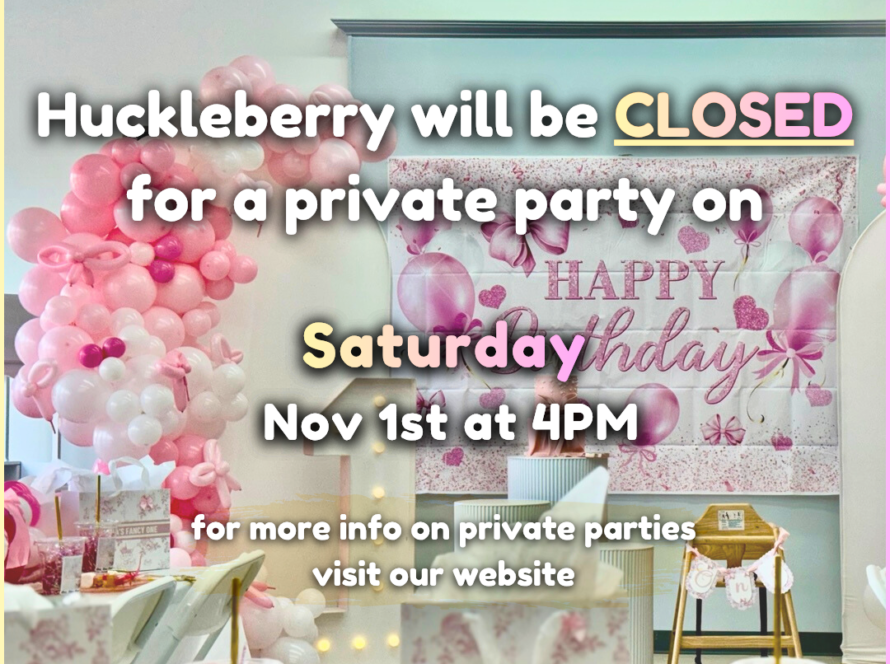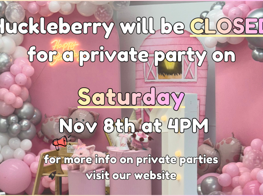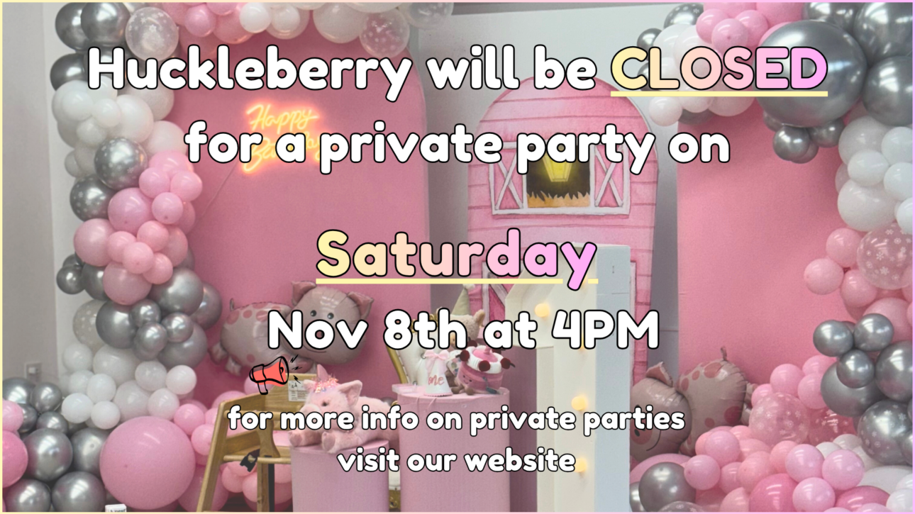 Please note that Huckleberry will be closed from 4 PM to 6 PM due to a private party. We appreciate your understanding and hope to see you before or after the event for more playtime fun!