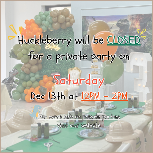Huckleberry will be temporarily closed from 12:00β2:00 PM for a private party and will be open during all other hours.