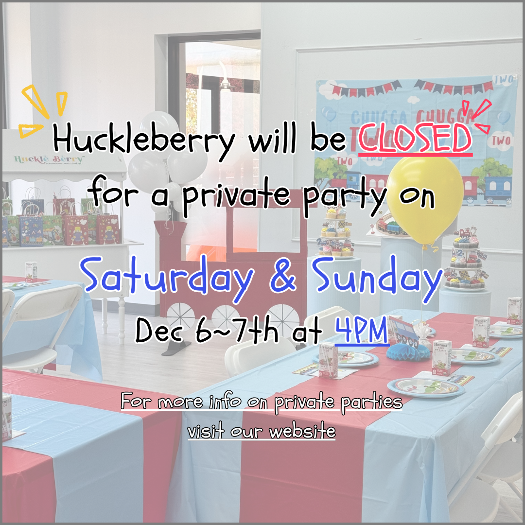 On December 6 and 7, Saturday and Sunday, Huckleberry will be open from 9 AM to 4 PM only due to private parties.
